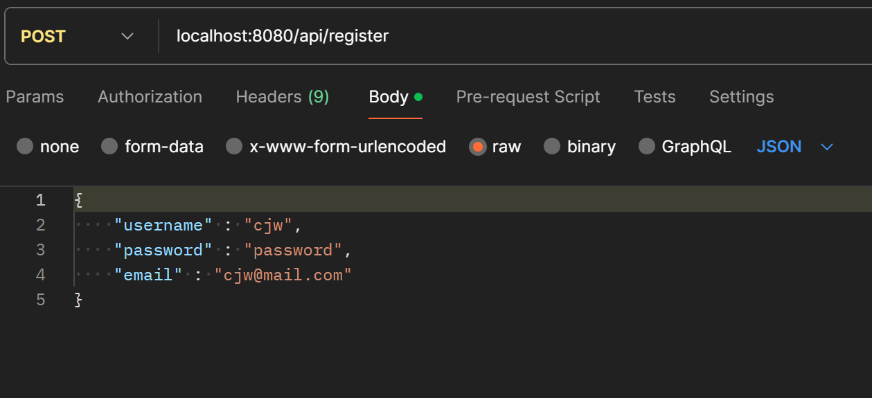 엔드포인트를 /api/register로 지정하고 postman으로 요청을 보내본다.