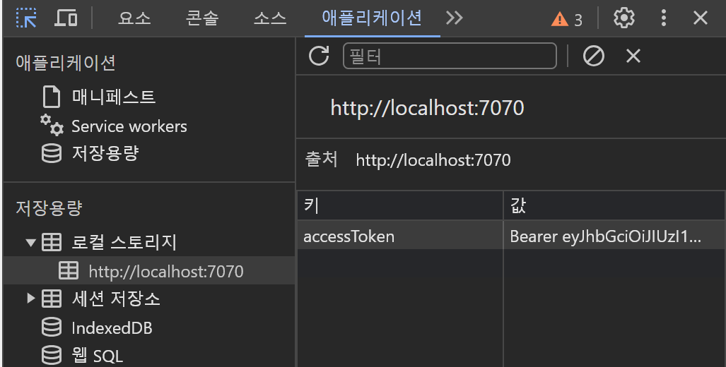로컬 스토리지에 저장된 accessToken의 모습. 유효 기간이 지나면 새롭게 발급될 것이다.